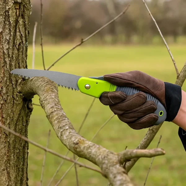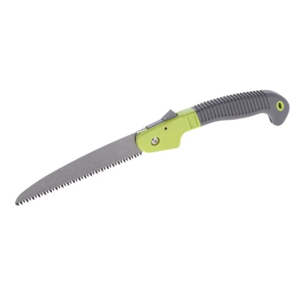 Foldbar håndsag med 18 cm varmebehandlet blad i herdet stål. Ergonomisk håndtak og skarp egg for effektiv skjæring av grener og treverk.