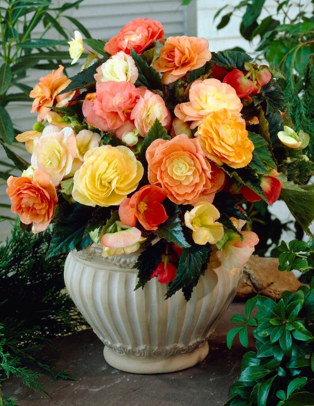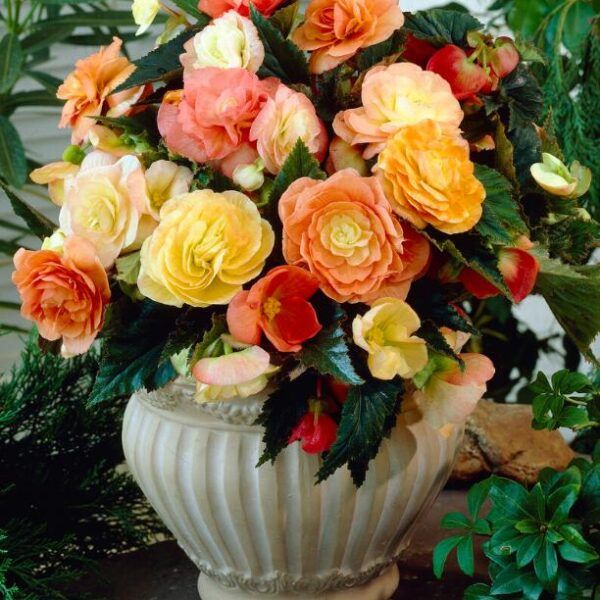 Knollbegonia (Begonia × tuberhybrida m.fl.) gir store, fyldige blomster fra tidlig sommer til frost, i alt fra klassiske fylte blomster til hengende kaskader. Den trives i halvskygge til lett sol (morgen-/kveldssol), i luftig og veldrenert jord med jevn fukt. Perfekt i krukker, ampler og lune bed. Full fylde kommer ofte fra år 2 når knollen får stå i ro og bygges opp.