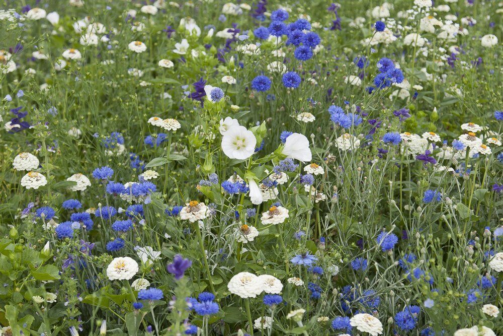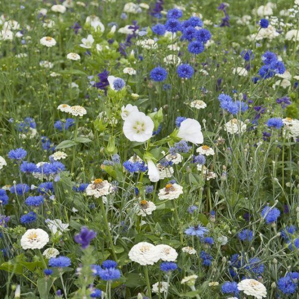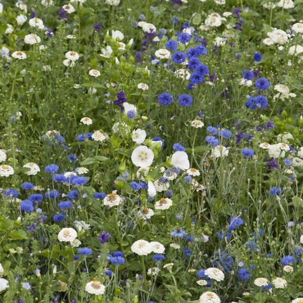 “Blåblomstrende eng” er en vakker samling av ettårige blomster som domineres av blå, lilla og hvite nyanser. Med klassiske blomster som kornblomst (centaurea cyanus), nigella damascena (jomfruen i det grønne) og convolvulus tricolor, skaper denne blandingen et rolig og kjølig fargespill, perfekt for å gi hagen en følelse av harmoni. Salvia farinacea og verbena bonariensis tilfører høyde og struktur, mens gypsophila og ageratum fyller ut med lette, luftige blomster.