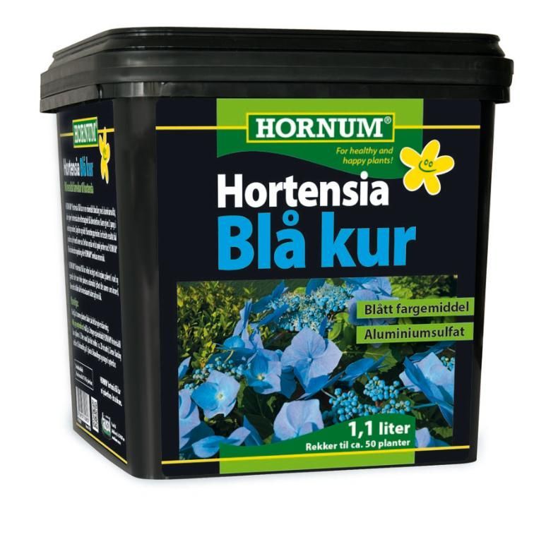 Hortensia Blå Kur er en mineralsk blanding med aluminiumsulfat, som gir Hortensia den ettertraktede blå blomsterfargen.