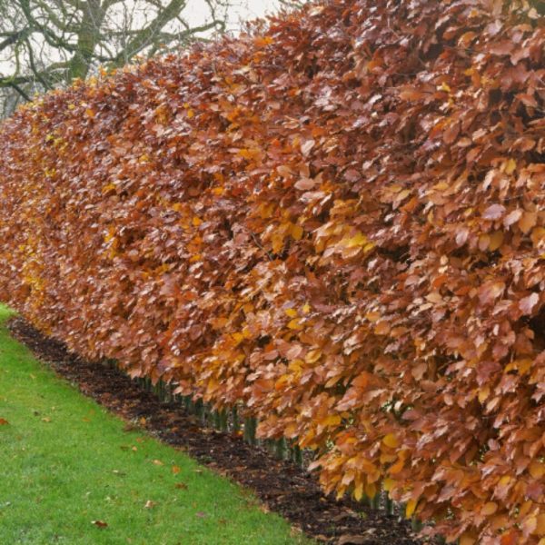 Tett vegg med vakker årstidsveksling: vårglans, dyp sommertone, kobber vinterløv og fin knopp-/grenstruktur. Gir lunhet, rom og akustisk ro i hagen.
