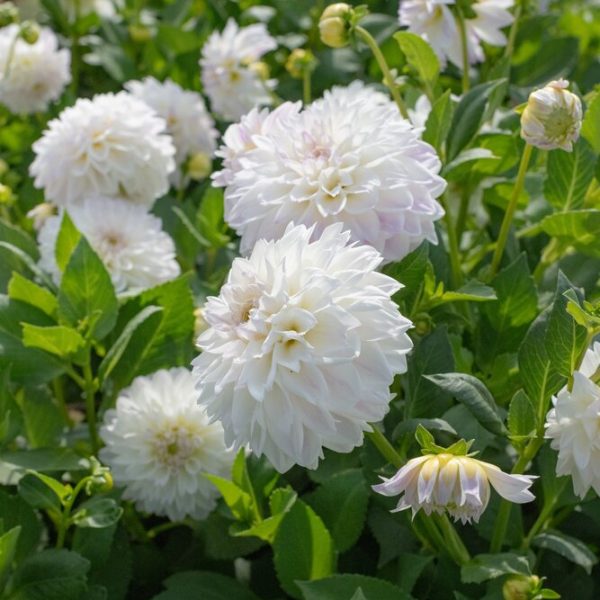 Dahlia 'White Pearl (Wittem)'Elegant dahlia i ren hvit farge med et lett hint av lilla som gir et friskt og moderne uttrykk. Store, dekorative blomster som passer perfekt til snitt. Blomstrer lenge og trives i sol og næringsrik, veldrenert jord.