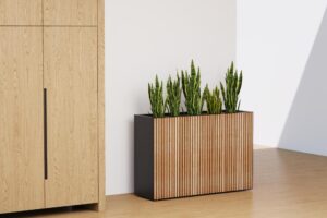 Moderne og flott plantekasse i solid stål med trespiler i front. Med både UV- og regnbeskyttelse holder kassen seg rustfri. Treverket i plantekassen bør behandles hvis kassene skal brukes utendørs. Kassene har har i tillegg en langtlevende lakkering i antrasitt og justerbar bunn med dreneringshull.