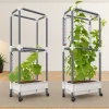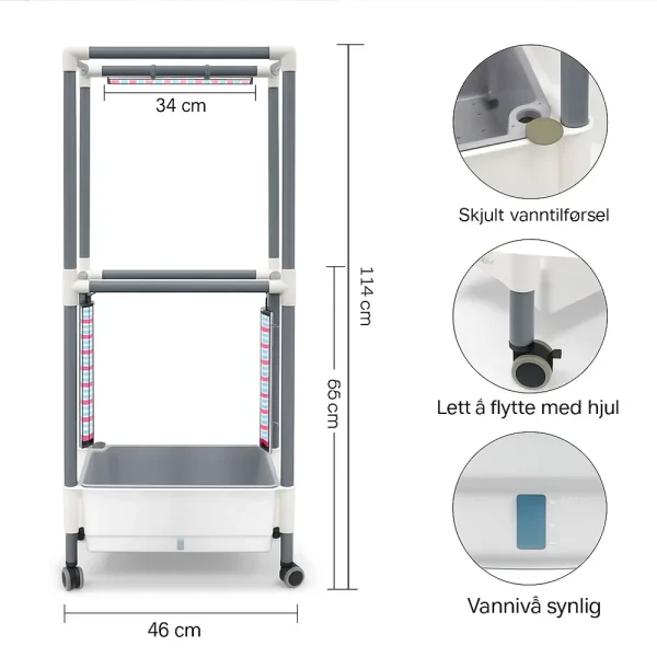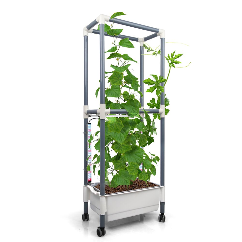 Systemet leveres komplett med klatreramme, plantekasser, LED-lys med elektronikk og vannpumpe med rør for sirkulasjon. Du fyller vann/næring i reservoar, setter i gang pumpen og lar systemet distribuere væske jevnt til plantene hele døgnet.