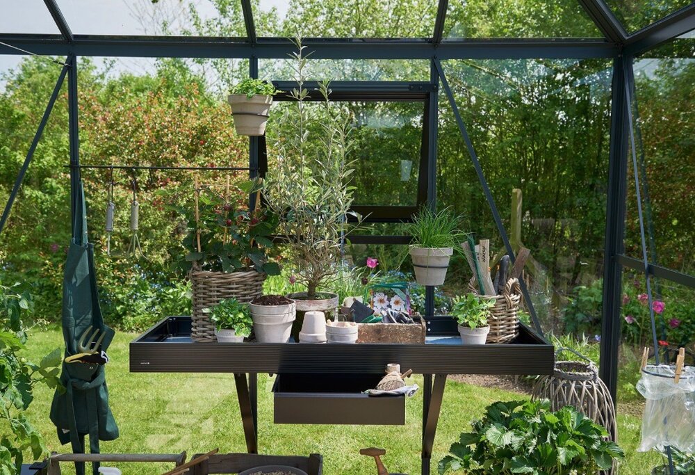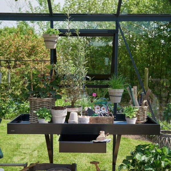 Dette sortlakkerte drivhusbordet, designet for Halls Magnum-drivhus, måler 142 x 52 cm og gir en solid og romslig arbeidsflate for alle dine hageprosjekter. Den pulverlakkerte overflaten sikrer langvarig beskyttelse mot rust og slitasje, mens det stilrene designet komplementerer drivhusets estetikk. Bordet er enkelt å montere og kan plasseres i ønsket høyde, noe som gir fleksibilitet og komfort under arbeidet. Med dette bordet får du en praktisk løsning for ompotting, såing og andre hageaktiviteter, samtidig som det bidrar til en organisert og effektiv arbeidsplass i drivhuset ditt.