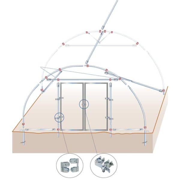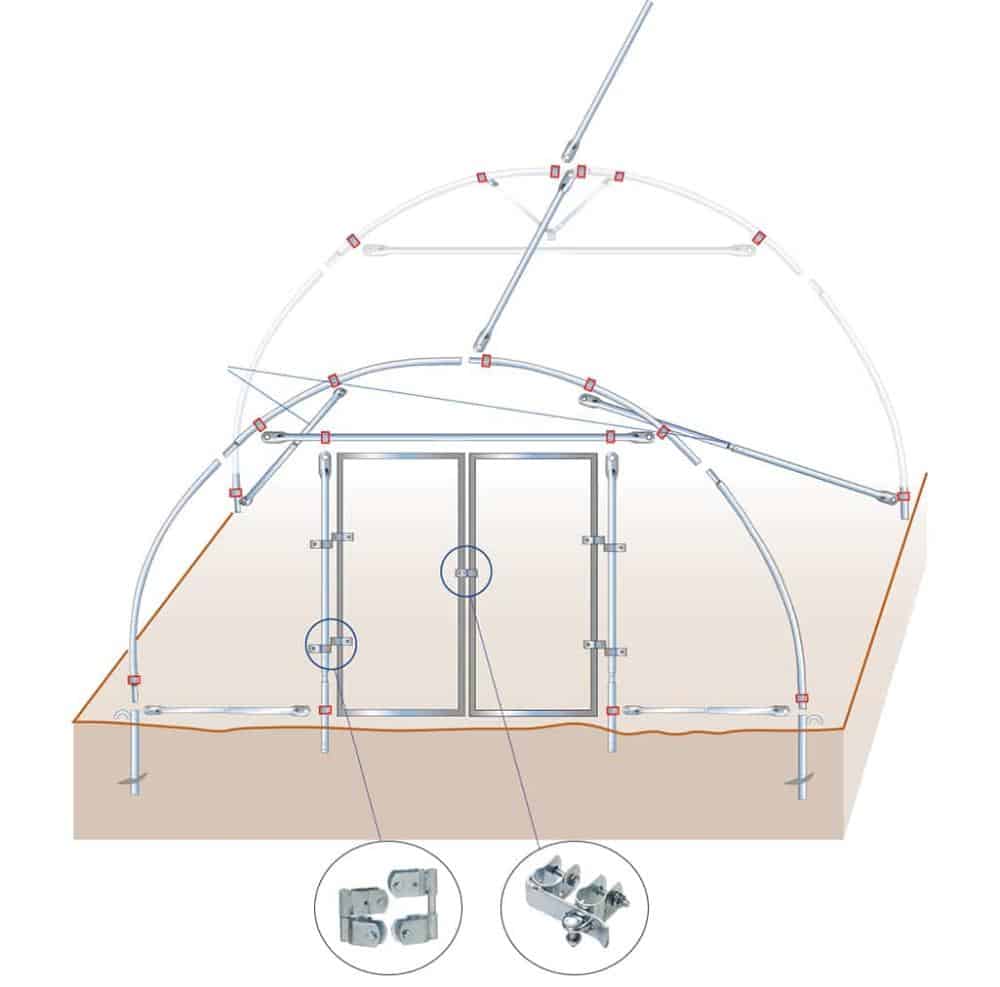 Byggesett i profesjonelt kvalitetsmateriale. Rammen er laget av galvanisert stål. Alle metallkoblinger og festeelementer, som ankere, strammeklips, dørhengsler og metallclips er laget i galvanisert materiale og brukes på samme måte i proffbransjen.