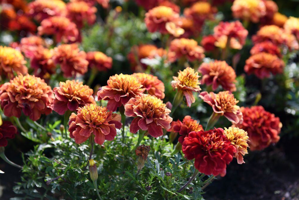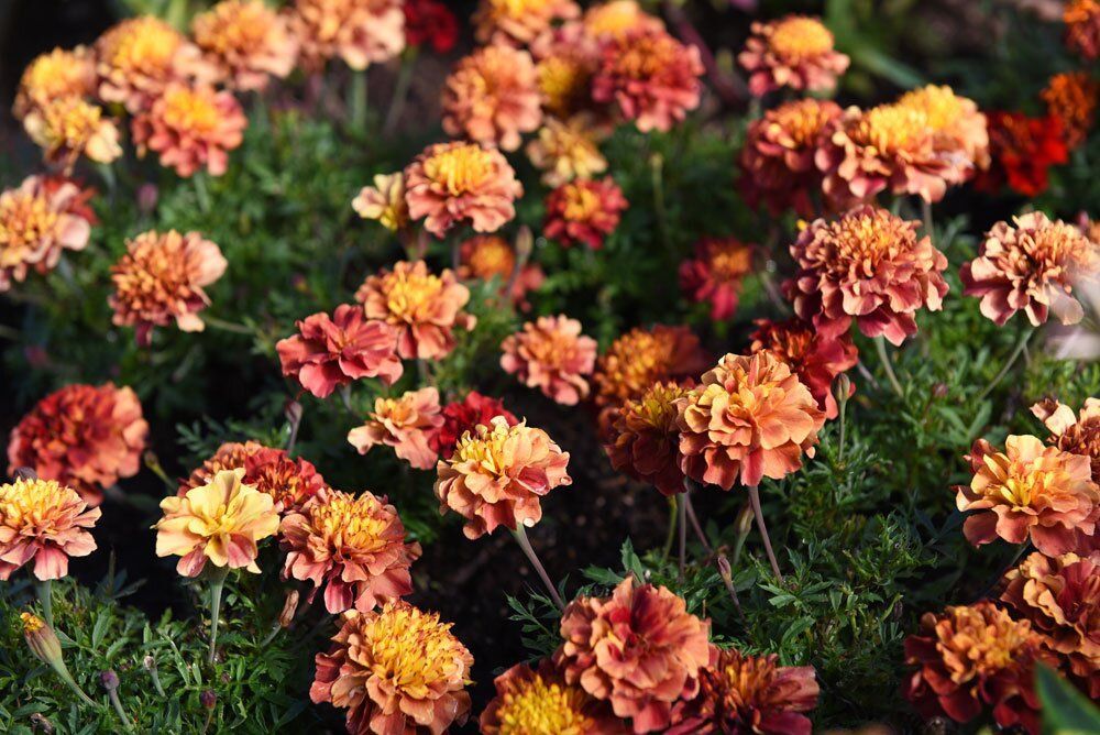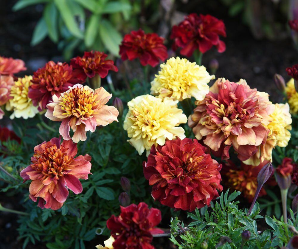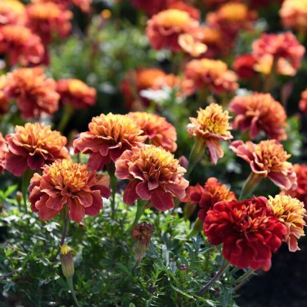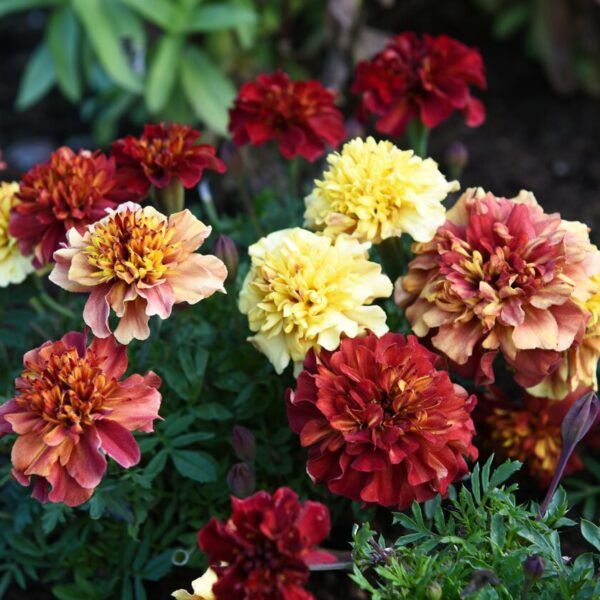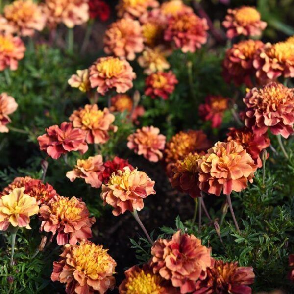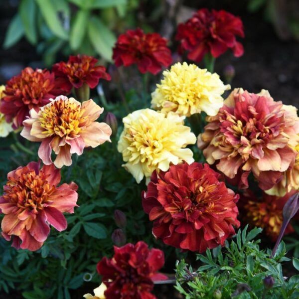 Helt fylte blomster med fascinerende fargespill fra dypt mahognyrødt til rosa, fersken og sitrongult. Blomstrer rikt i potter, blomsterkasser og blomsterbed.