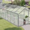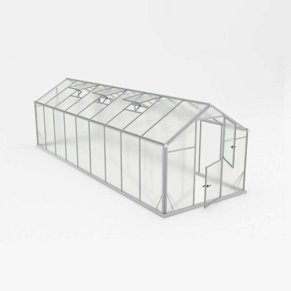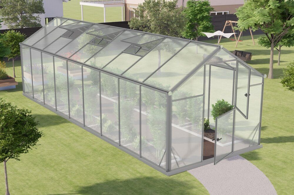 Drivhuset leveres med vegg- og takplater i 6 mm polykarbonat. Dette gir et drivhus som er optimalt for dyrking av planter. Drivhuset har inkludert takvindu med automatisk vindusåpner, sokkel og todelt dør.