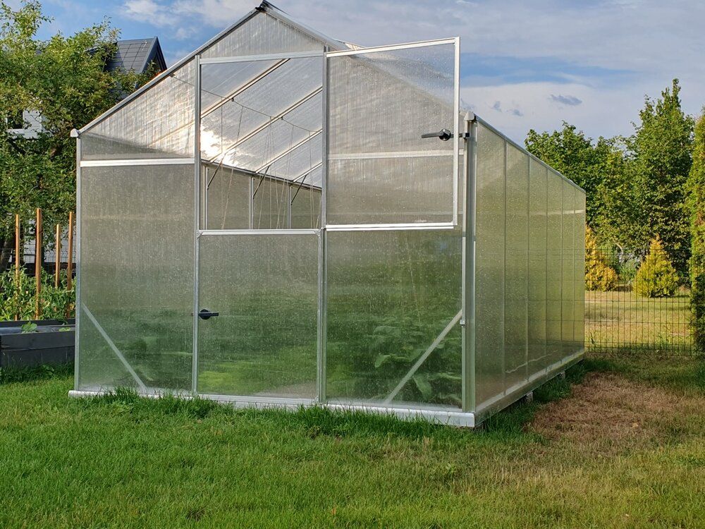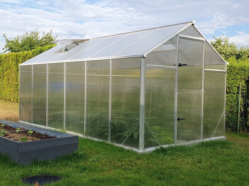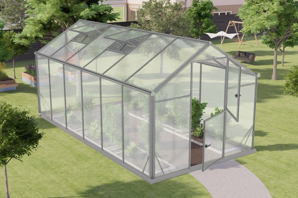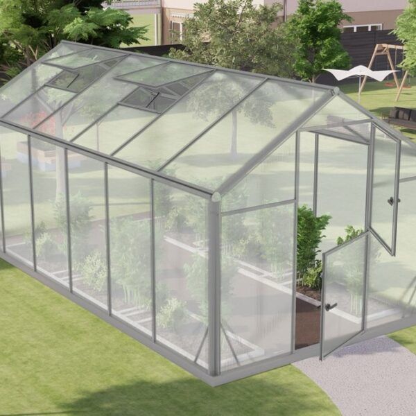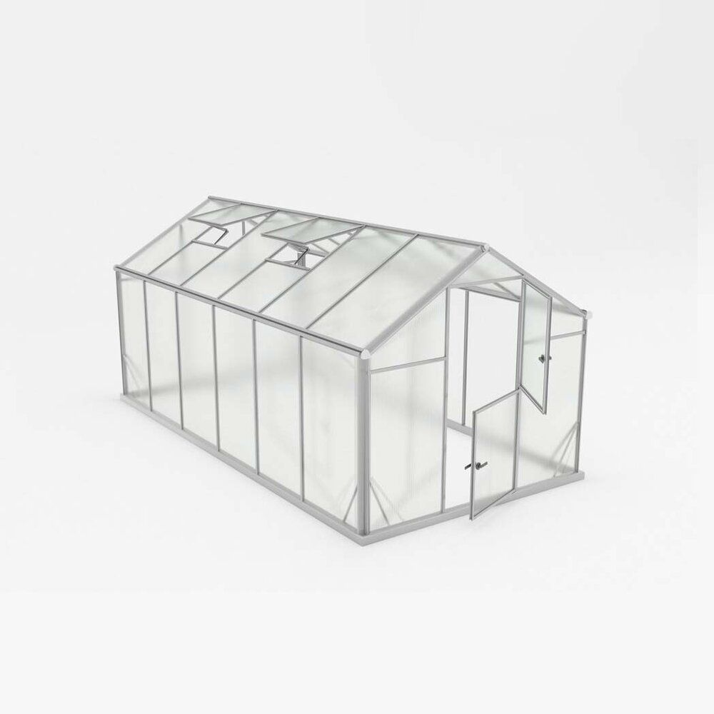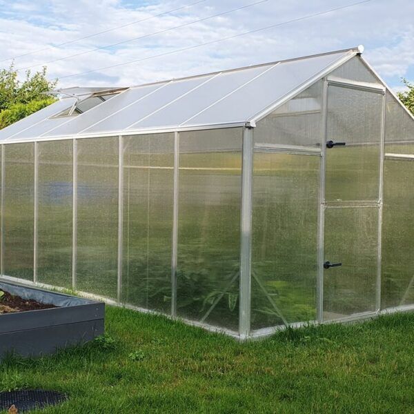 Drivhuset leveres med vegg- og takplater i 6 mm polykarbonat. Dette gir et drivhus som er optimalt for dyrking av planter. Drivhuset har inkludert takvindu med automatisk vindusåpner, sokkel og todelt dør.