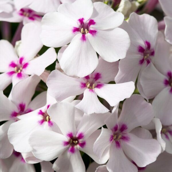 Juli–september med hvite skjermer og rosa øye – strålende i kveldslys og mot mørk bakgrunn. God snittblomst med søt duft.