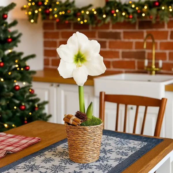 Hvit Amaryllis | 1 blomsterløk i flettet potte med pynt
