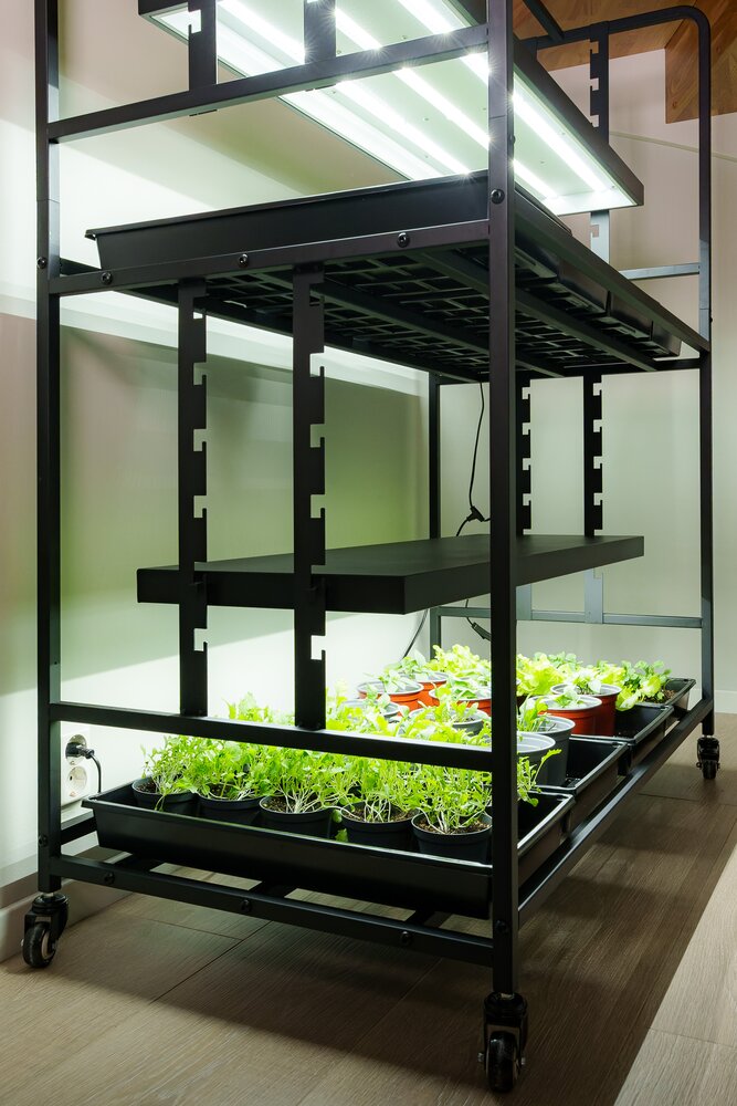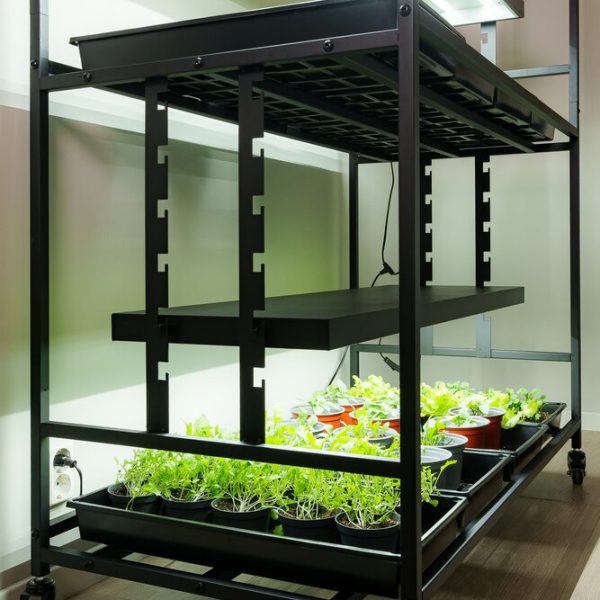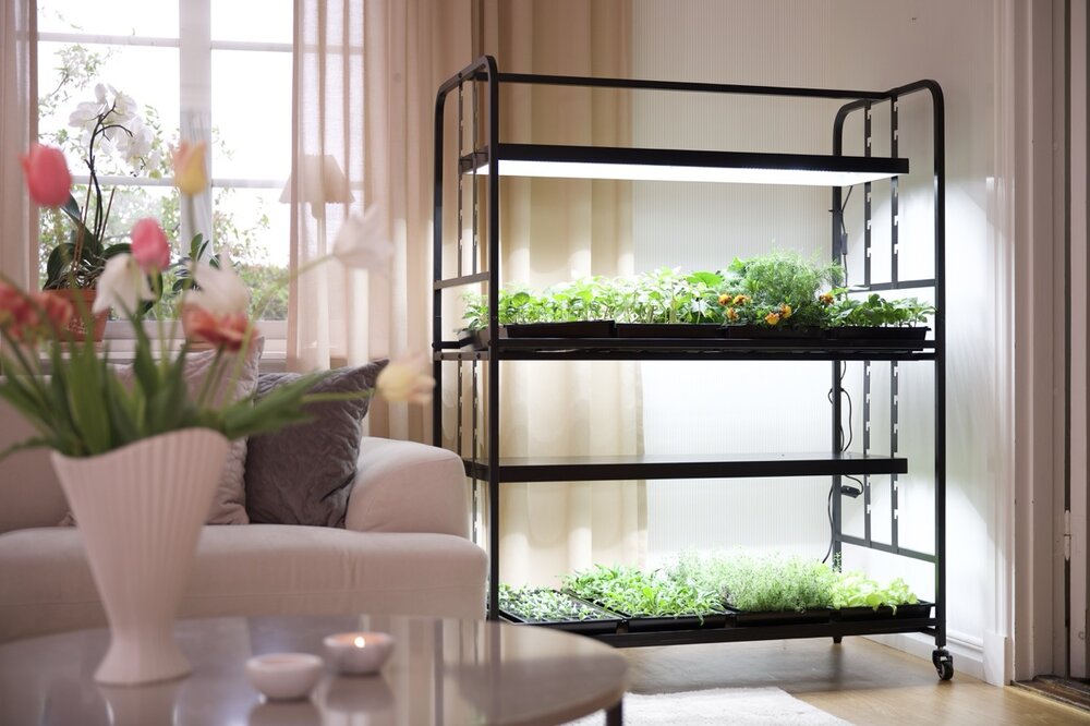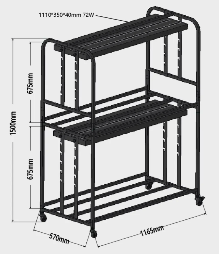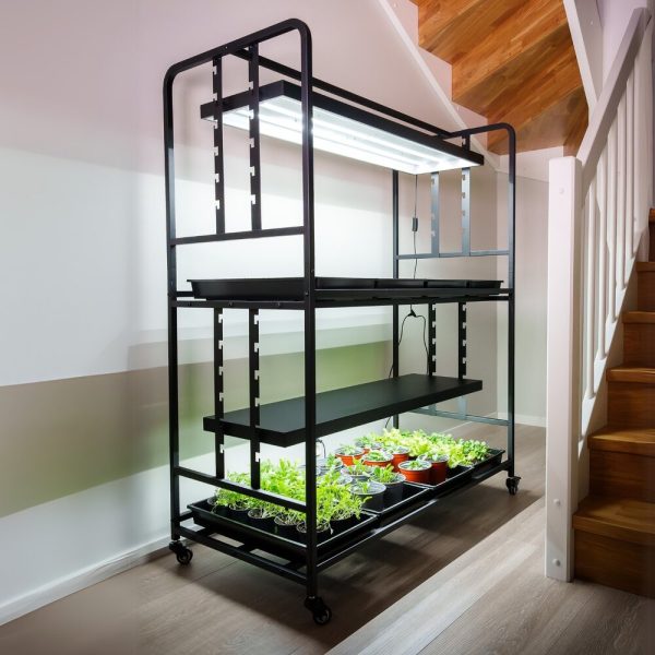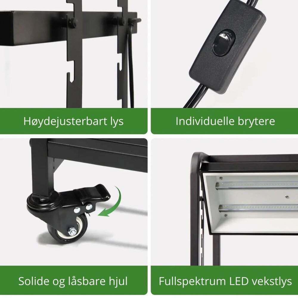 Med Dyrketralle Stor får du kapasitet til større dyrkeprosjekter hjemme. De kraftige LED-lysene på hele 72 W per armatur gir plantene en jevn og optimal lysdekning, som fremmer kraftig vekst. Trallen rommer flere brett samtidig og er ideell for både forkultivering, mikrogrønt og dyrking av grønnsaker eller urter året rundt. Den justerbare lyshøyden gjør at du kan tilpasse lysforholdene i takt med plantenes utvikling. Solide hjul gjør den enkel å flytte, mens låsbare hjul gir sikkerhet og stabilitet.