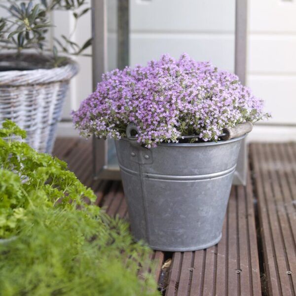 Levert i en 3L-potte, klar til utplanting. Grav en grop litt større enn rotklumpen, løs opp jorden godt og tilfør gjerne sand eller grus for bedre drenering. Sett planten i samme dybde som i potten, fyll på med jord og vann forsiktig. En planteavstand på ca. 20–30 cm gir rom for tett, krypende vekst og god luftsirkulasjon.