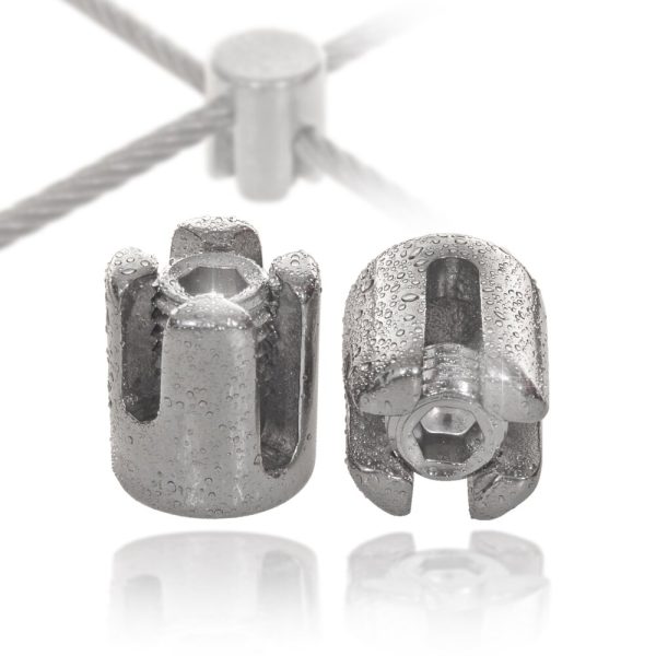 Kryss-stykket holder wirene adskilt med presisjon, slik at de ikke gnager mot hverandre. Den solide utformingen sikrer at kryssforbindelsen tåler belastning, spenning og bevegelser fra planter og vind. Montering skjer ved at wirene føres gjennom klammeren og festes med egnet klemmeteknikk.