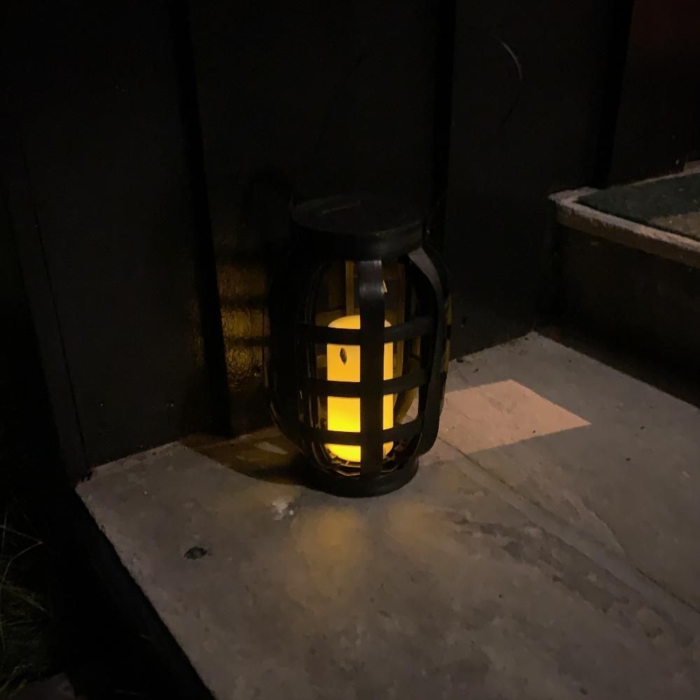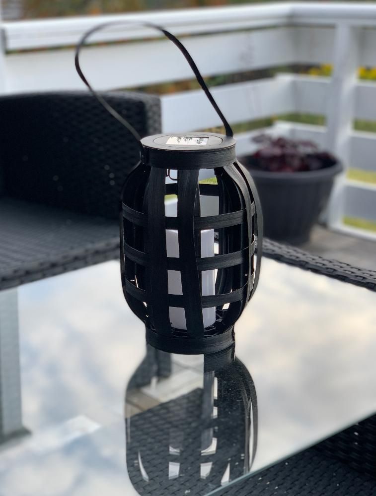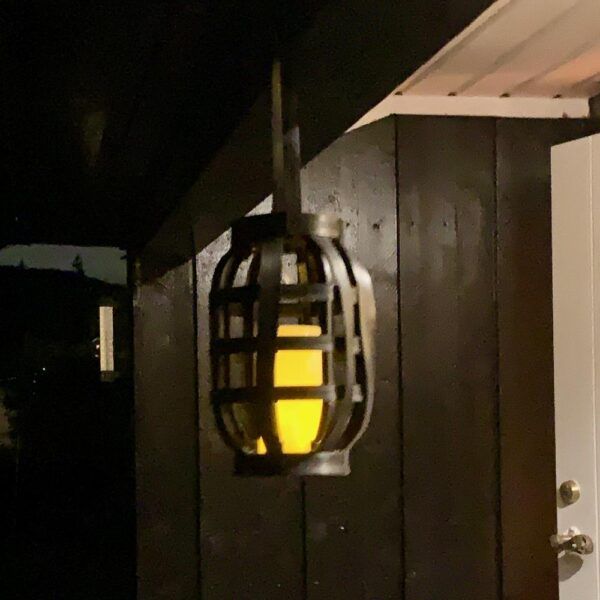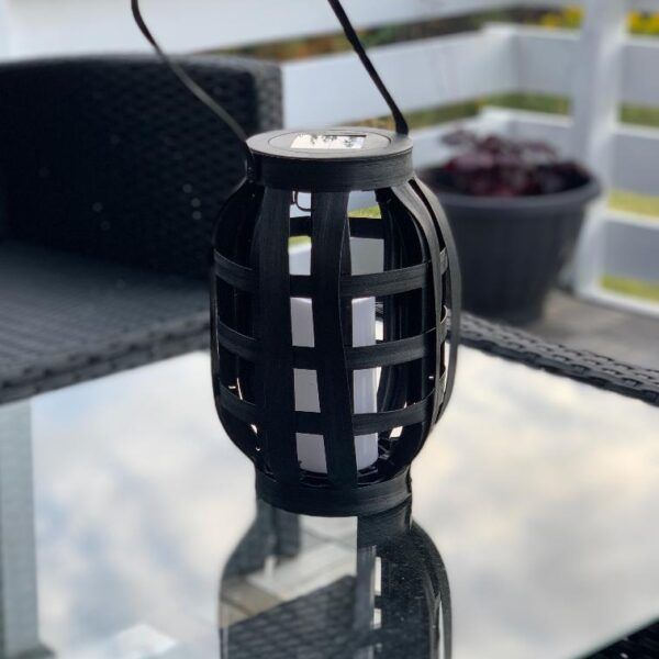 Lanterne som kan henges eller stå på bordet som drives av solcelleladede batterier (medfølger).