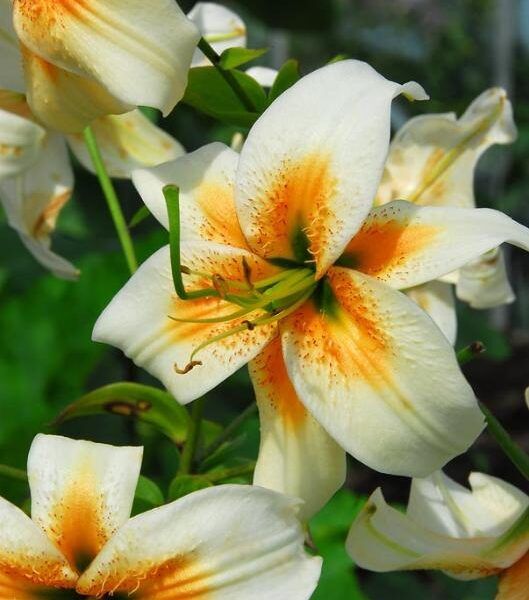 Eksklusiv trompetlilje med hvite kronblad og oransje senter. Ca. 100–120 cm høy og blomstrer i juli–august. Trives i sol og veldrenert jord. En klassisk og duftende sort for hage og vase.