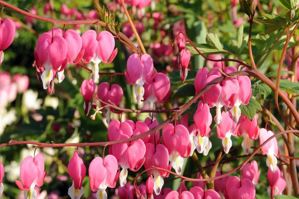Mai–juni, noen ganger lenger i kjølige, fuktige somre. De rosa (eller hvite hos enkelte sorter) hjertene åpner seg sekvensielt og tåler lett regn. Ypperlig kontrast til bregner, lungeurt og tidlig hosta.