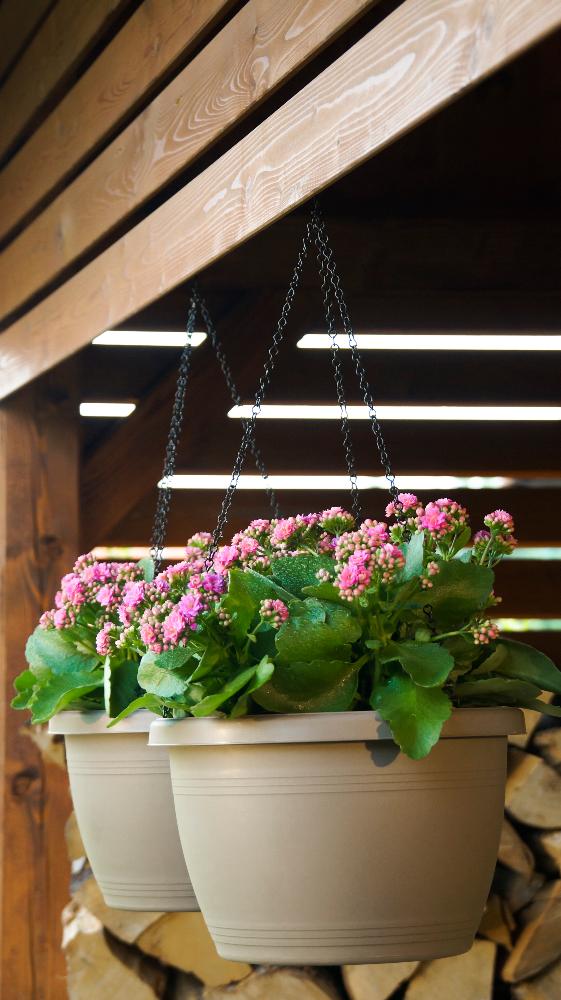 Elegant hengeampel i resirkulert kvalitetsplast med oppheng og komplett selvvanningssystem. Påfylling av vann gjøres enkelt på siden av potten og nivåindikator angir vannivået.