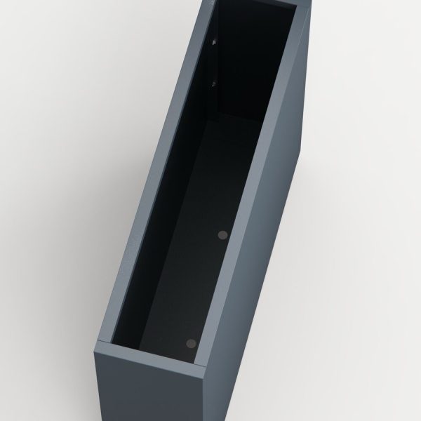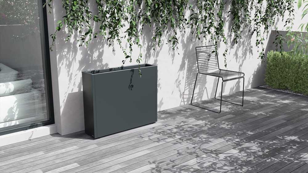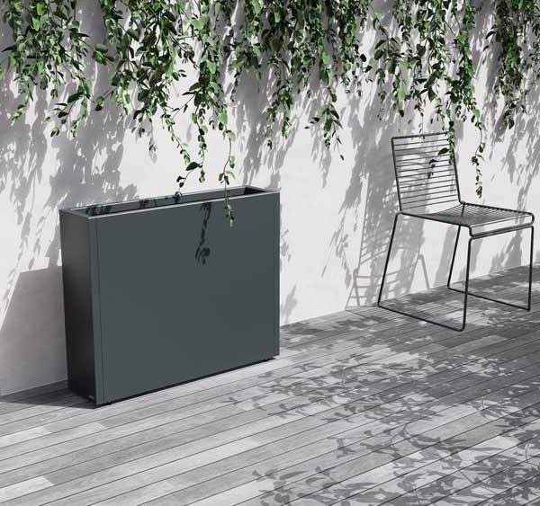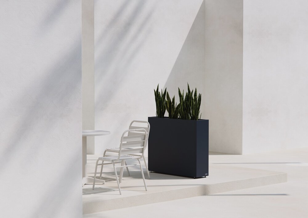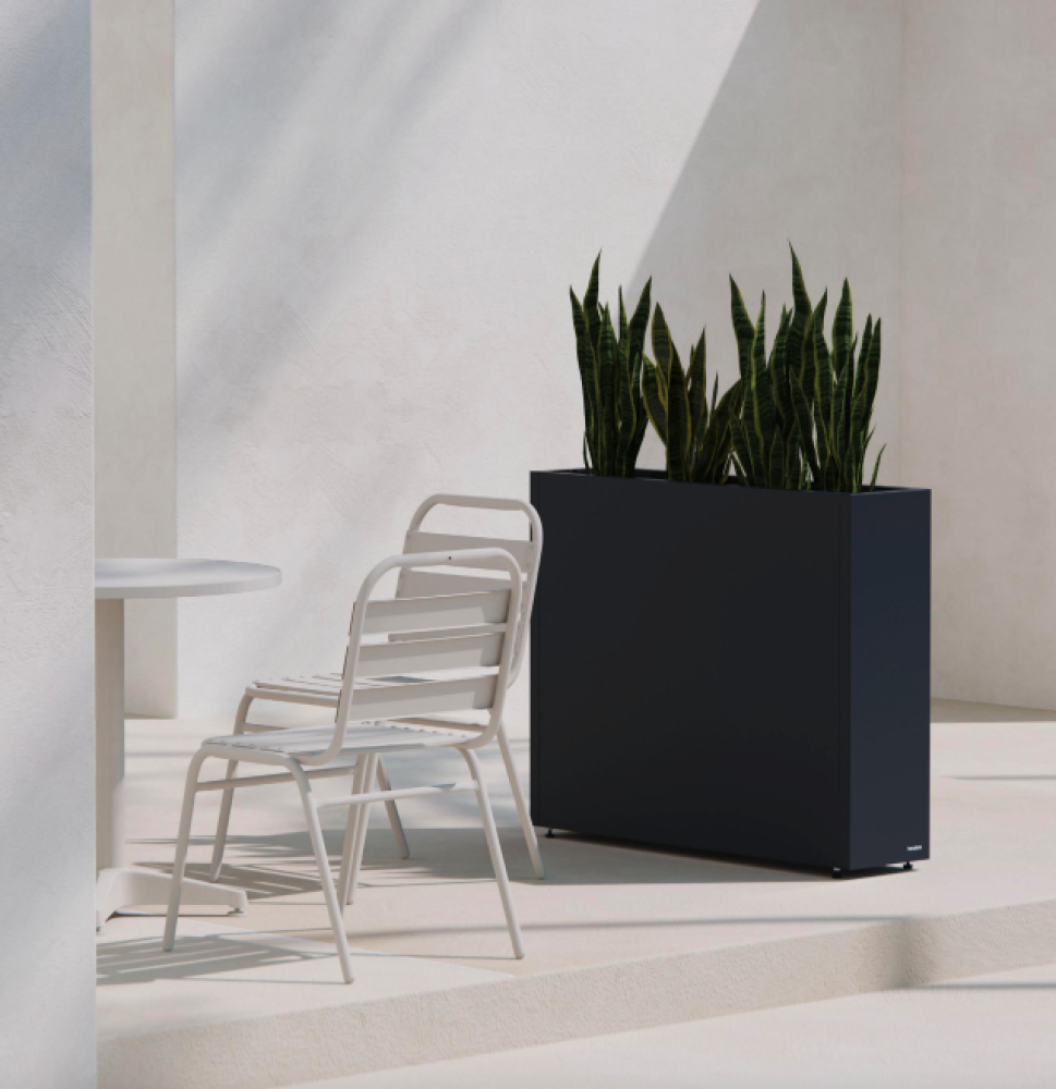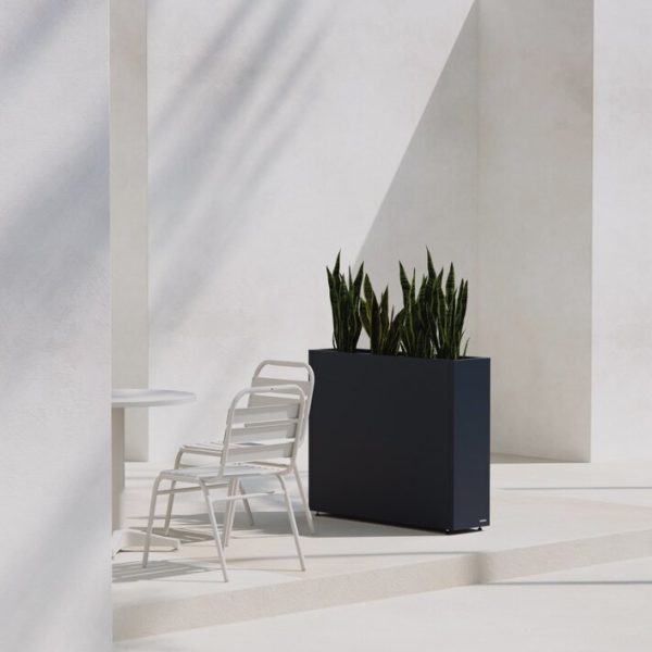 Stilren plantekasse i stål med mål på 100x25x80 cm, designet for å skape romdelere i hagen eller på terrassen. Slitesterk pulverlakk i antrasitt gir værbestandighet og et moderne uttrykk. Kombineres enkelt med andre kasser i et modulært system. Tilpasningsmuligheter som selvvanning, hjul og lys gir ekstra funksjonalitet.