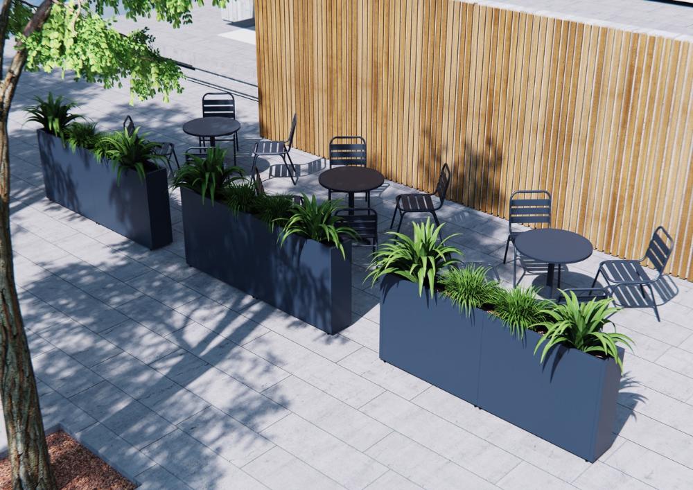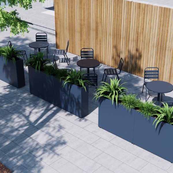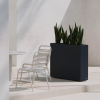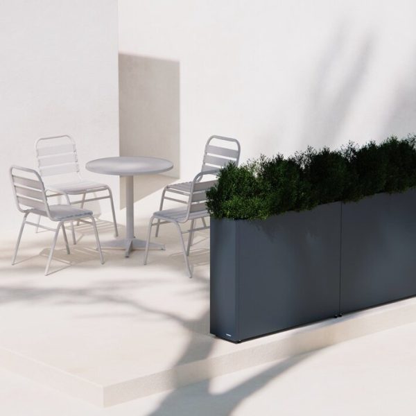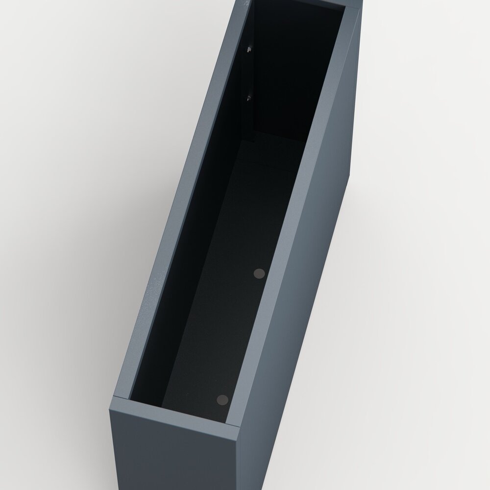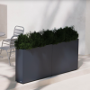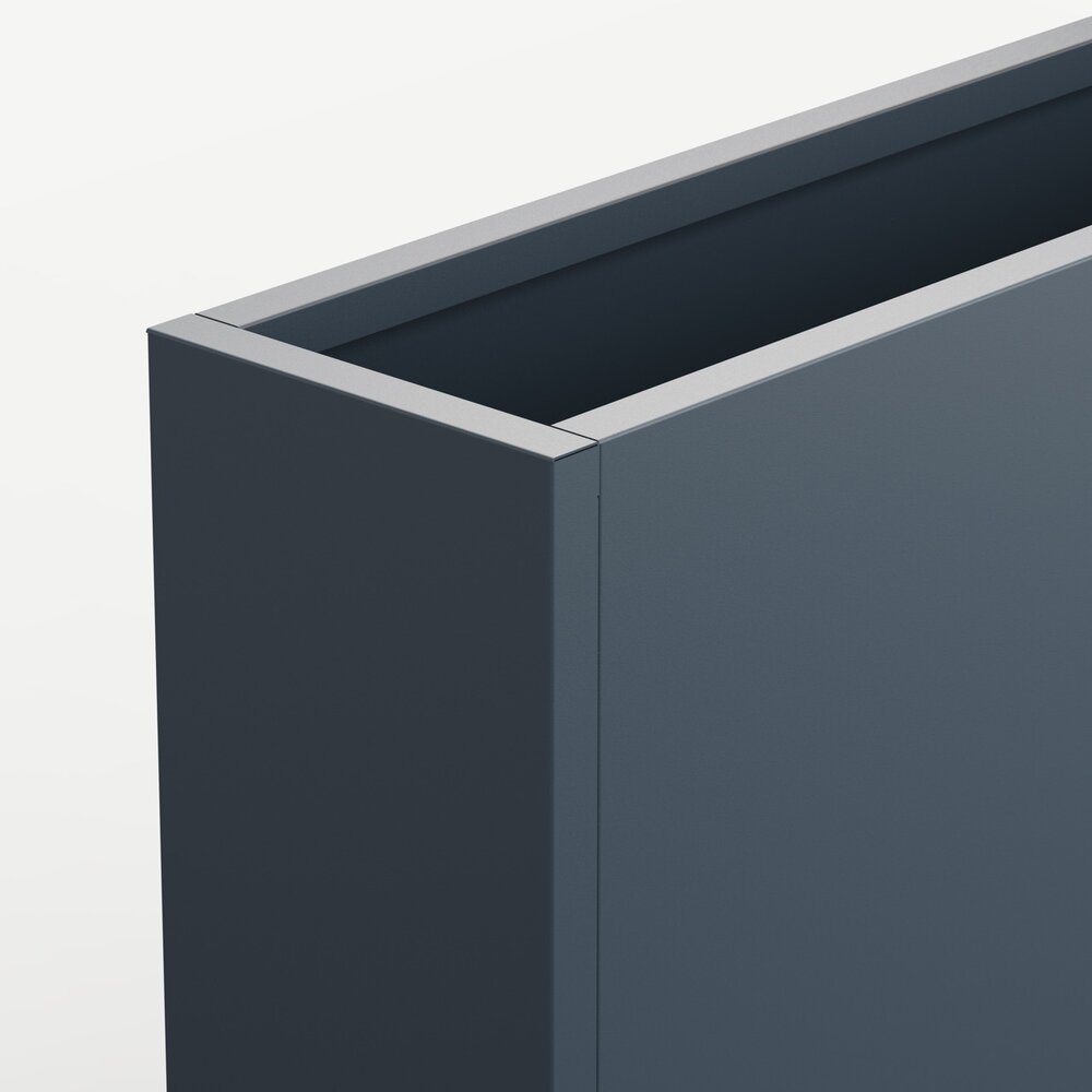 Stilren plantekasse i stål med mål på 100x25x80 cm, designet for å skape romdelere i hagen eller på terrassen. Slitesterk pulverlakk i antrasitt gir værbestandighet og et moderne uttrykk. Kombineres enkelt med andre kasser i et modulært system. Tilpasningsmuligheter som selvvanning, hjul og lys gir ekstra funksjonalitet.