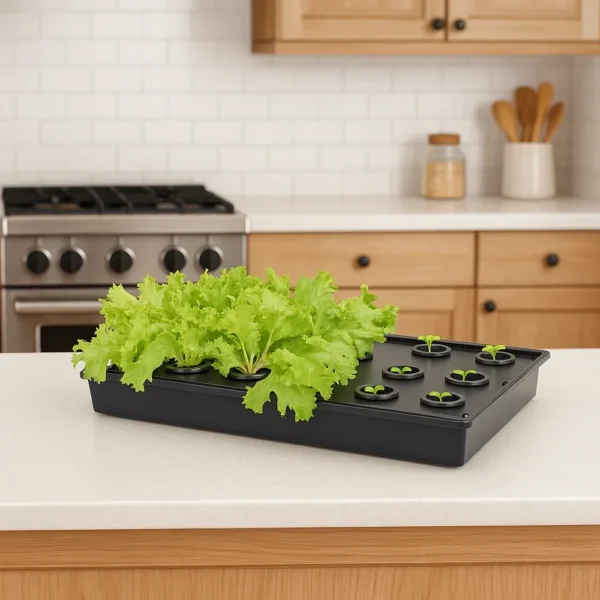 Systemet består av vannbrett, lokk i PP-plast, kurvholdere og dyrkesvamper som holder plantene på plass. Den hygieniske løsningen reduserer bakterievekst og gir renere og raskere spiring.