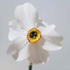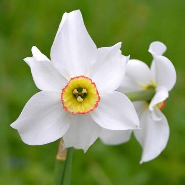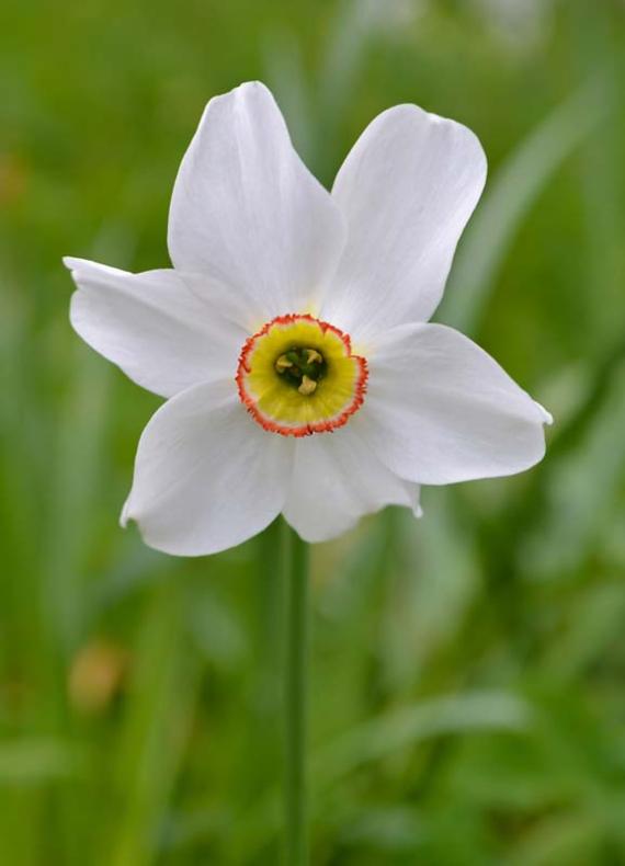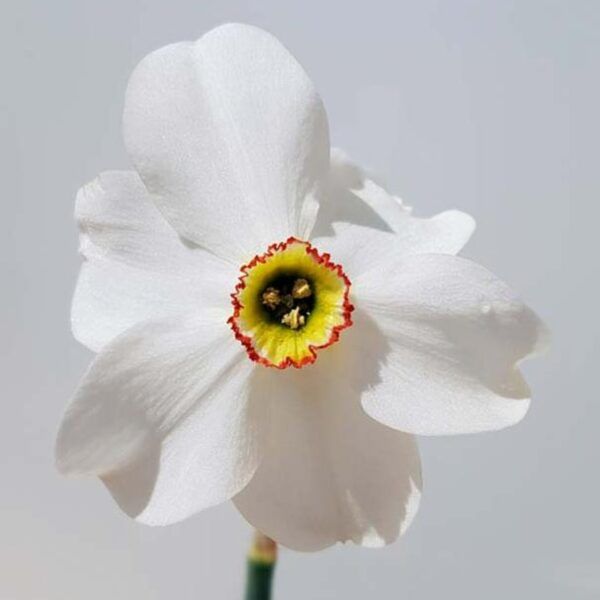 Renhvite kronblader med rødt øye. Blant de senest blomstrende påskeliljene.