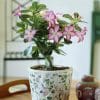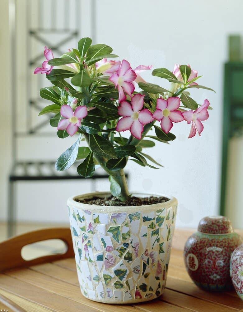 Levert i potte er Ørkenrosen enkel å plante om i en større beholder med godt drenert jord. Velg en potte med god drenering, gjerne terrakotta som slipper ut fukt. Ved ompotting bør caudexen plasseres synlig over jordoverflaten for best estetisk uttrykk og sunn vekst. Unngå å plante den for dypt, da dette kan føre til råte.