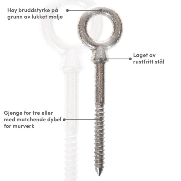 Øyebolten har en gjennomgående ring som gir et jevnt feste for wire uten skarpe kanter som kan skade trådene. Ved montering bør du bore et forboringshull først (for å unngå sprekkdannelse i treverket), skru bolten forsiktig inn, og sikre at den sitter godt og stivt. Bruk av rustfri låsemutter eller låsemiddel kan vurderes for ekstra sikkerhet mot løsning over tid.