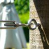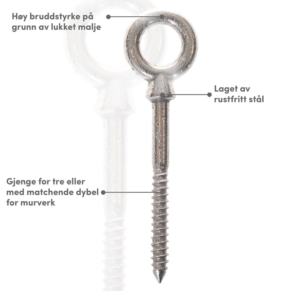 Materialet er korrosjonsbestandig, og tåler fukt, saltluft og temperatursvingninger – slik at den passer godt også i kystnære omgivelser. Øyebolten gir et elegant og robust feste for wiren, med minimal visuell påvirkning i trematerialer.