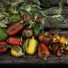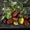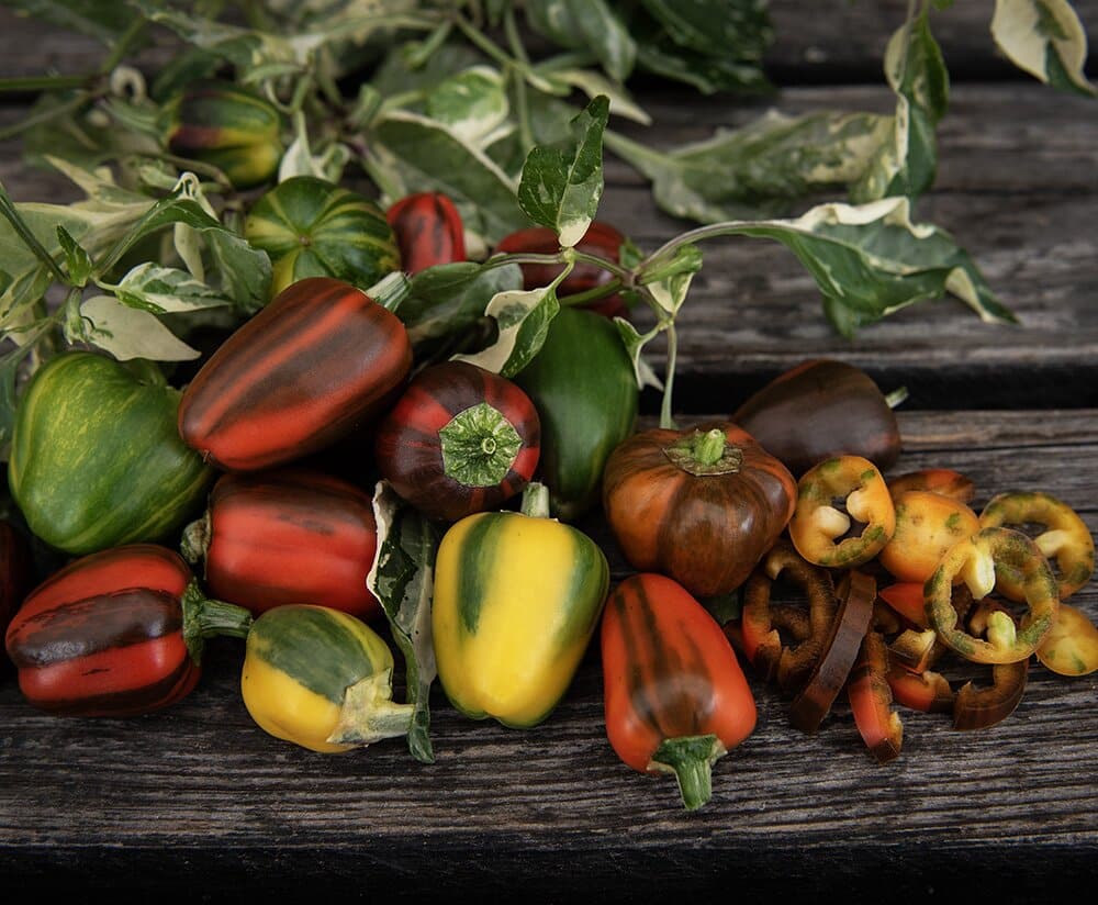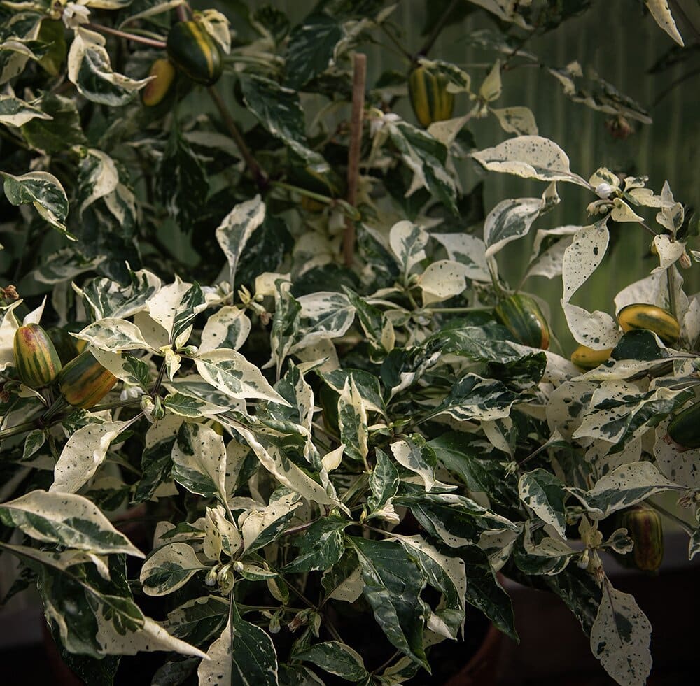 Minipaprika. Runde til ovale, små frukter i et sprakende fargespill som går fra stripete gult, grønt og oransje, og modner til dypt rødt med brune striper. Sprø og gode med søt smak, perfekt som snacks. Vakkert, hvitmarmorert bladverk på godt forgrenede planter. Også dekorativ som prydplante.