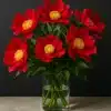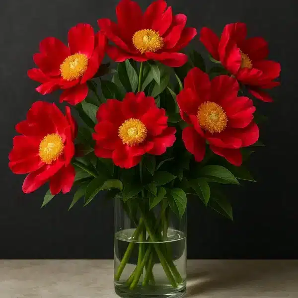 Rød peon med store, enkle blomster og gyllent midtparti som lyser opp bedet fra forsommeren. Sterke stilker tåler regn, og planten trives i sol til halvskygge i næringsrik, veldrenert jord. Perfekt både som langlivet staude og til snitt i buketter.