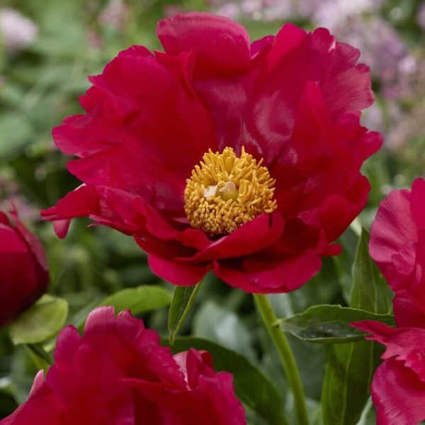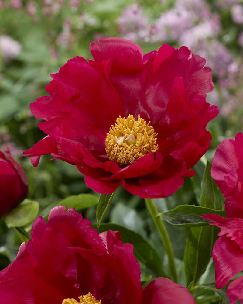 Rød peon med store, enkle blomster og gyllent midtparti som lyser opp bedet fra forsommeren. Sterke stilker tåler regn, og planten trives i sol til halvskygge i næringsrik, veldrenert jord. Perfekt både som langlivet staude og til snitt i buketter.