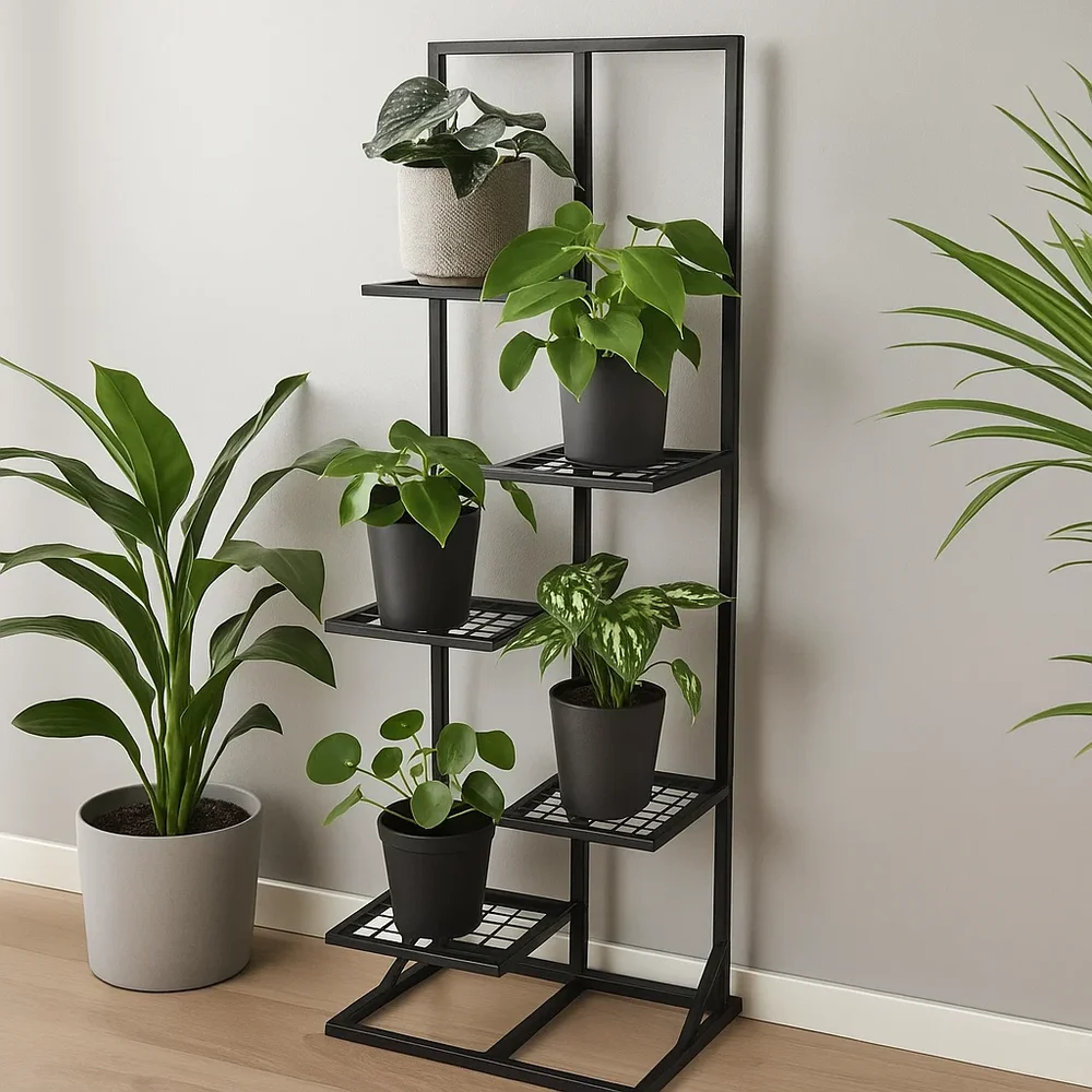 Praktisk og stilren plantehylle i sortlakkert metall med 4 hyller. Perfekt for å vise frem planter og dekor. Enkel å montere, passer både ute og inne.