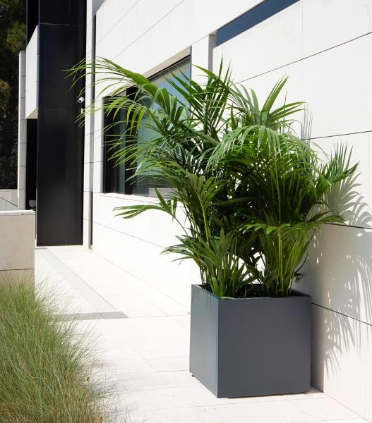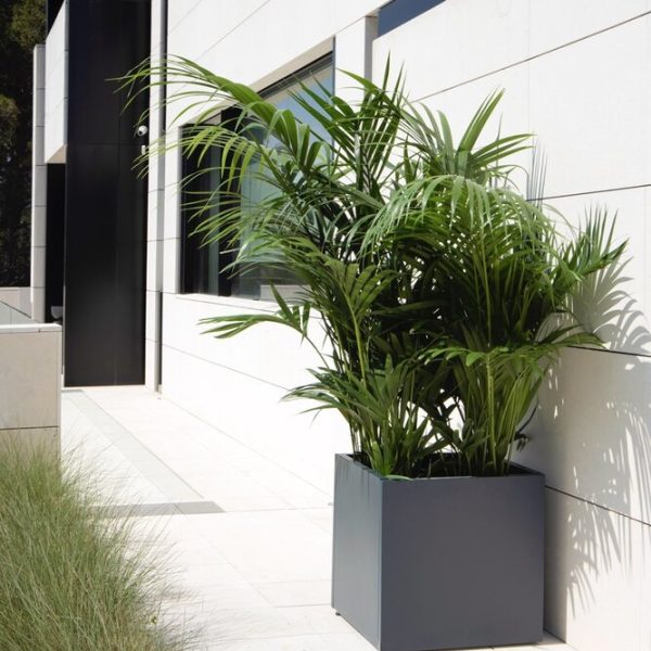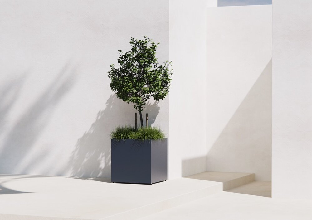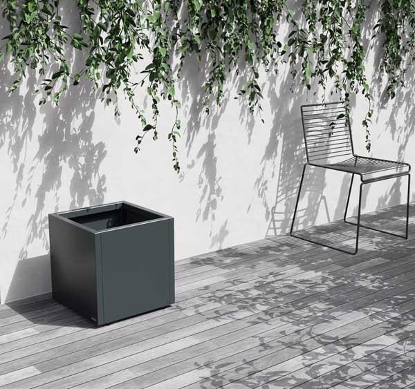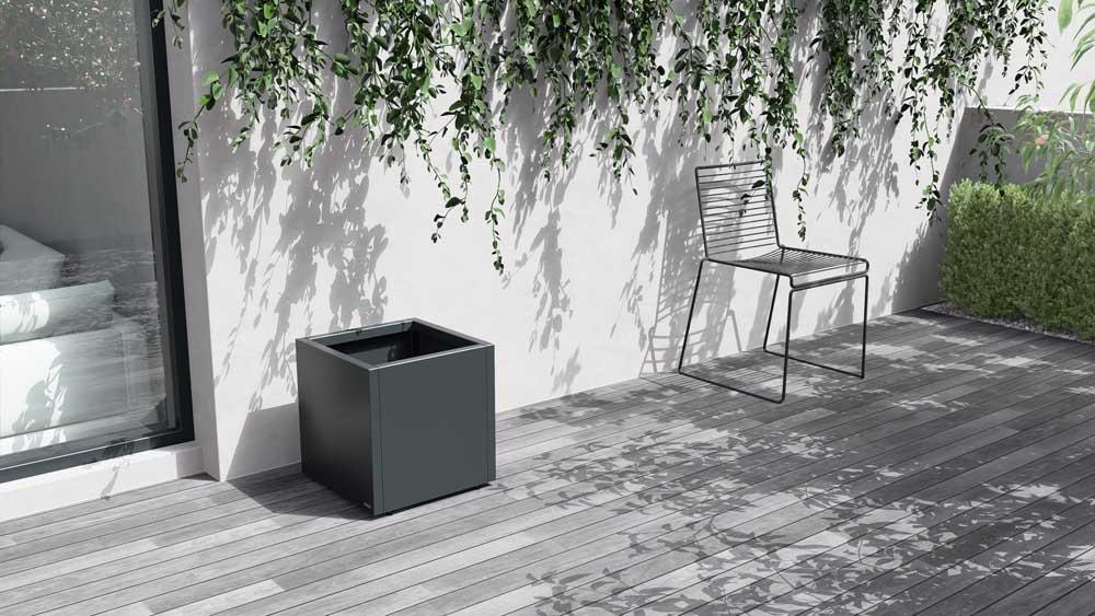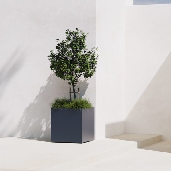 Denne plantekassen i stål kombinerer funksjonalitet og estetikk med sin kubeform på 70x70x70 cm. Størrelsen gir god plass til større planter, trær eller komplekse blomsteroppsatser, og den fungerer både som et blikkfang og et praktisk element i uterommet.