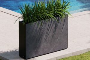 Elegant plantekasse med marmorlaminat og mål på 120x25x80 cm. Perfekt som romdeler eller dekorativt element både inne og ute. Solid stålramme og justerbar bunn gir fleksibilitet og holdbarhet. Kompatibel med tilbehør som hjul, selvvanningssystem og belysning for ekstra funksjonalitet.