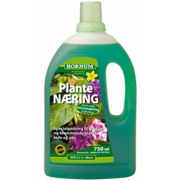 HORNUM® Plantenæring er velegnet til både grønne og blomstrende planter. Dosering: 5 ml til 1 liter vann. Innholdet rekker til 150 liter gjødselsvann.