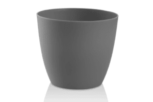 Enkel, pen, matt stein-farget potte. Tett bunn med forhøyning for å kunne sette enkel plastpotte inni.