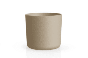 Enkel, pen, matt askegrå-farget potte. Tett bunn med forhøyning for å kunne sette enkel plastpotte inni.