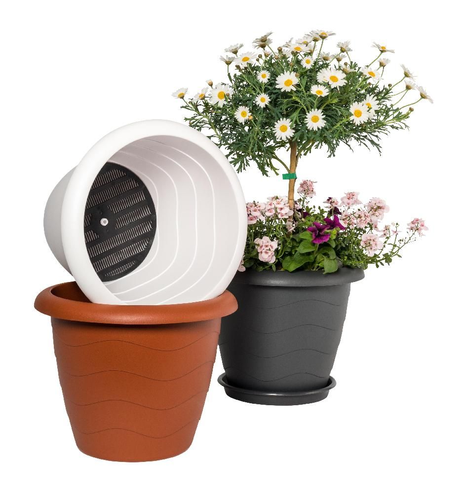 Dekorativ potte i solid plast med praktisk vannreservoar som sørger for jevn og tilstrekkelig fuktighet til plantene over tid. Dette betyr at du kan glede deg over sunne og vakre planter uten konstant vanning. Den stilige og moderne potten er meget solid og tåler godt varierende vær.