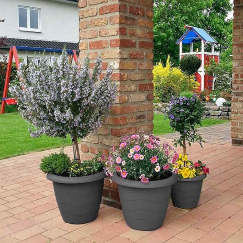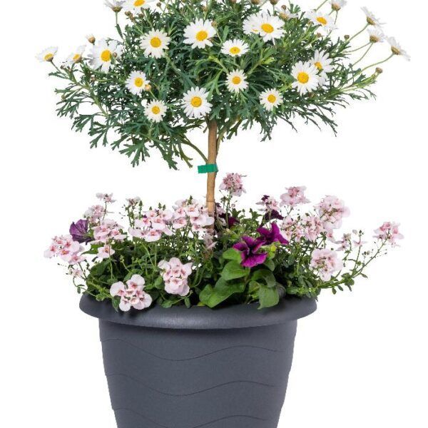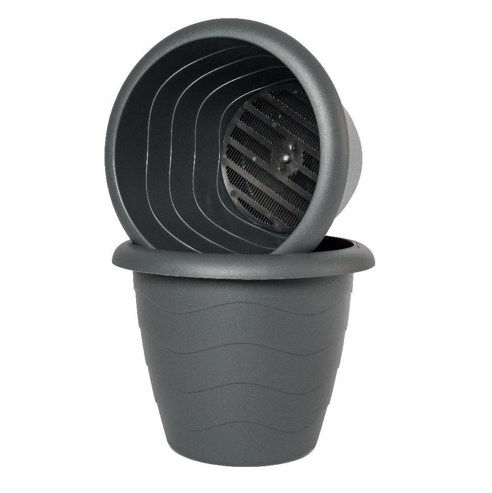 Dekorativ potte i solid plast med praktisk vannreservoar som sørger for jevn og tilstrekkelig fuktighet til plantene over tid. Dette betyr at du kan glede deg over sunne og vakre planter uten konstant vanning. Den stilige og moderne potten er meget solid og tåler godt varierende vær.