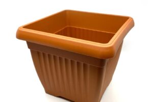 Firkantede plastpotter i terracotta-imitasjon. Gjennomfargede og svært holdbare potter som tåler mange års bruk uten å falme. Ideell for både innendørs og utendørs bruk. Skål kan kjøpes som tilbehør.