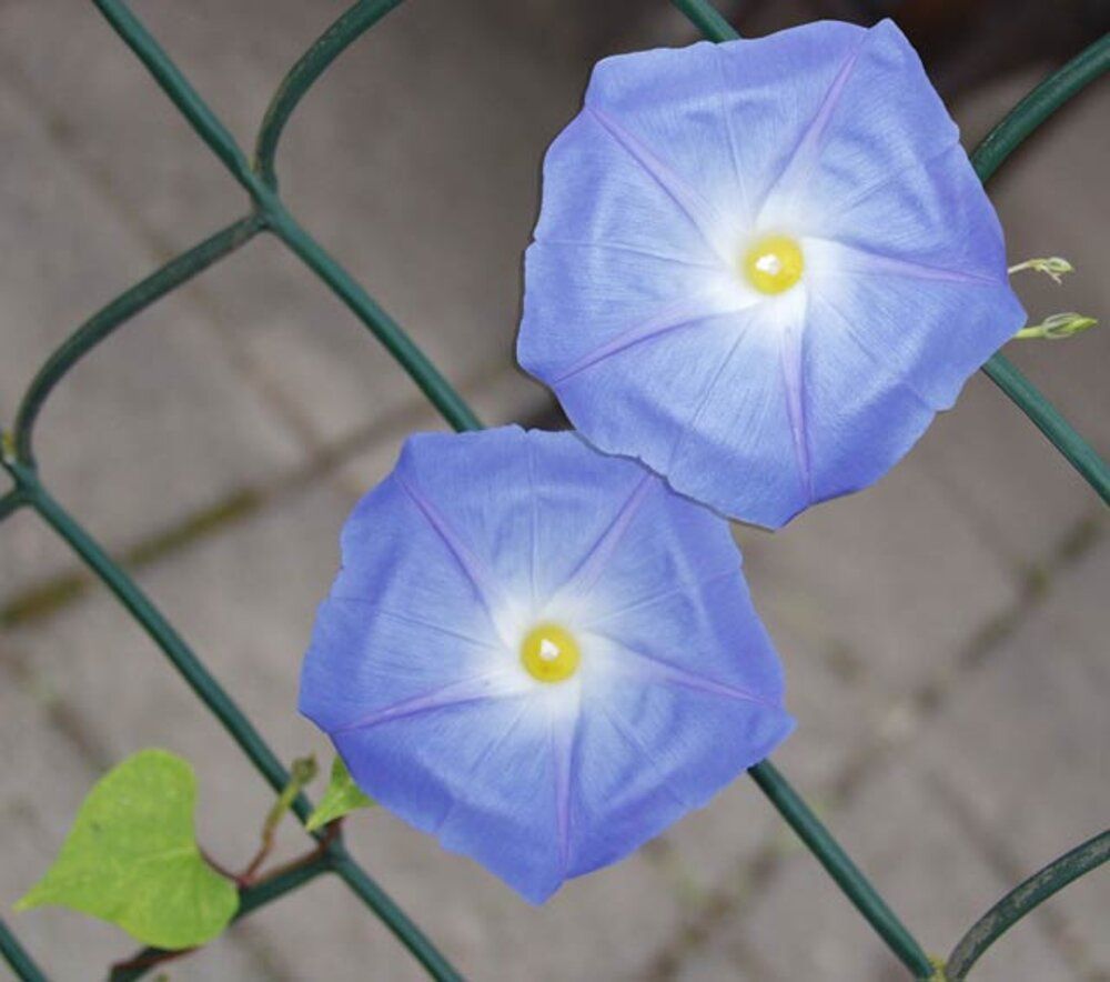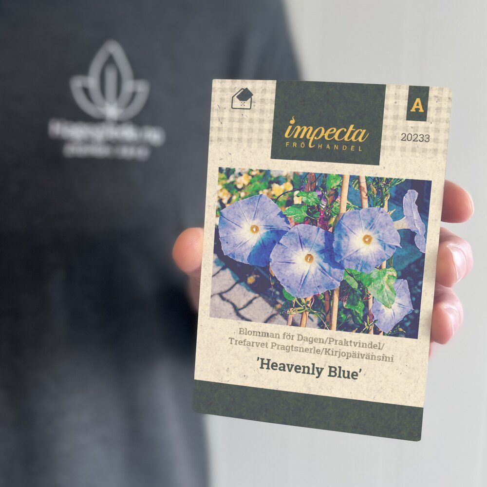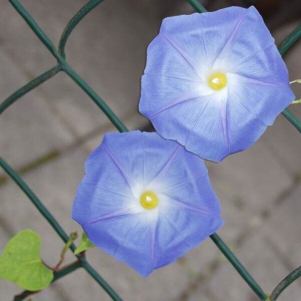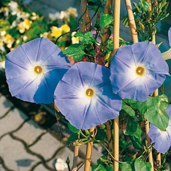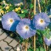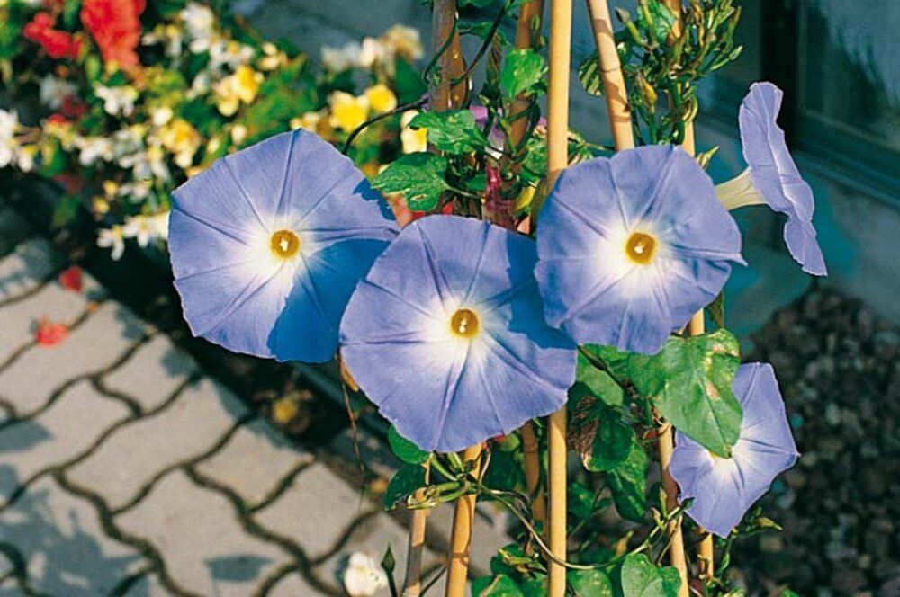 Blomstrer stort med himmelblå blomster. Slyngplante til potter og kasser. Dyrkes i espalier eller liknende.
