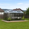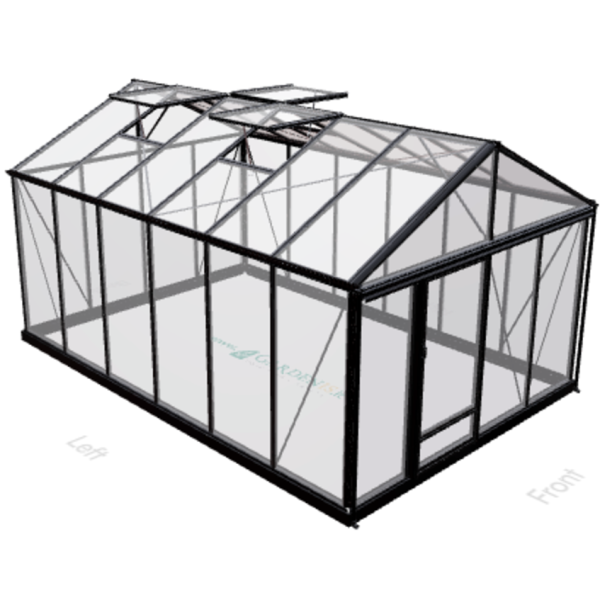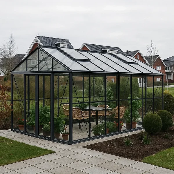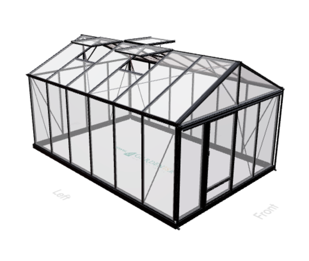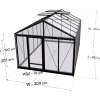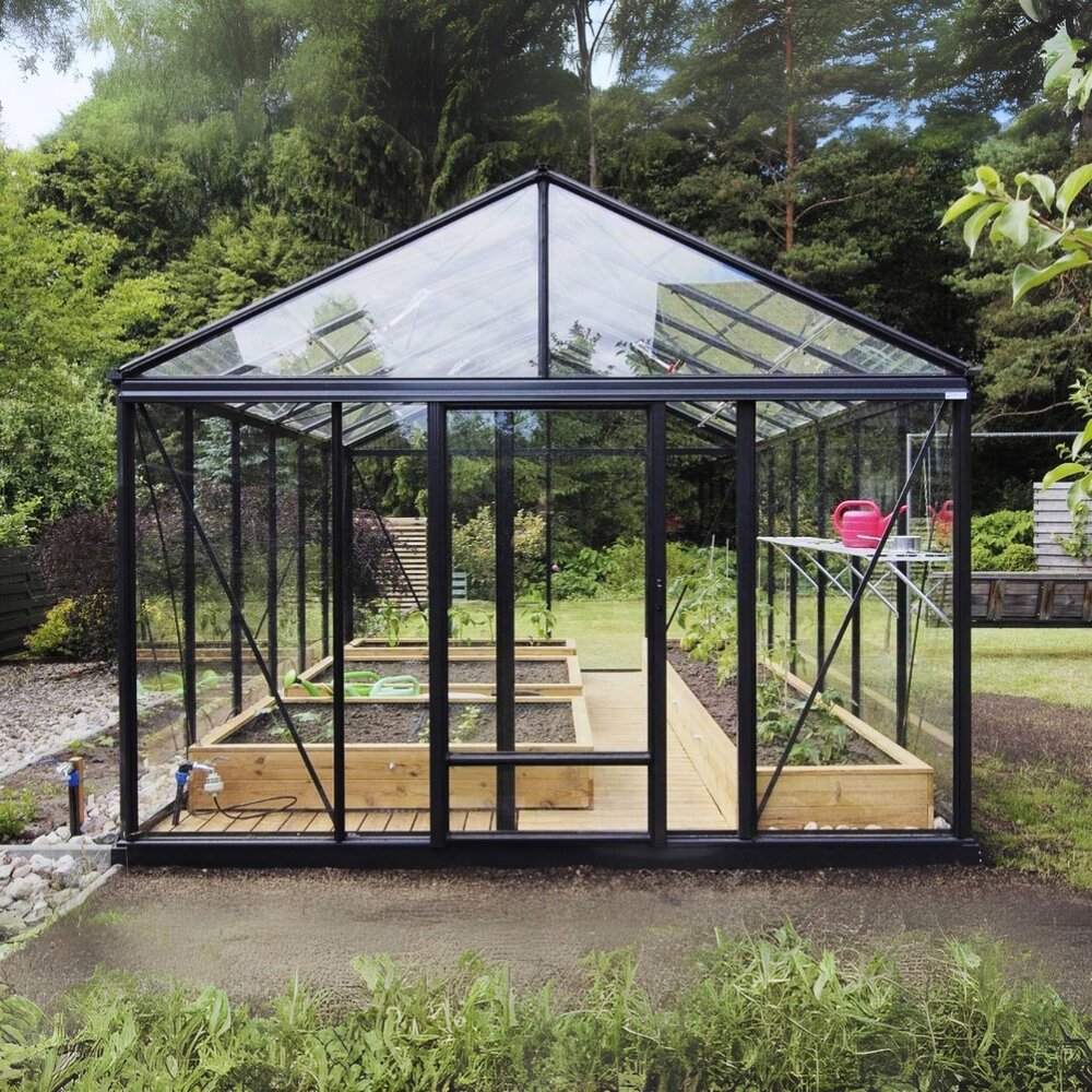 Drivhuset leveres flatpakket med delkomponenter og monteringsbeslag. Grunnramme, profiler, glasspaneler og festemateriell medfølger. Anbefalt montering av 2–3 personer; ca. 1–2 dager avhengig av erfaring og grunnforhold.