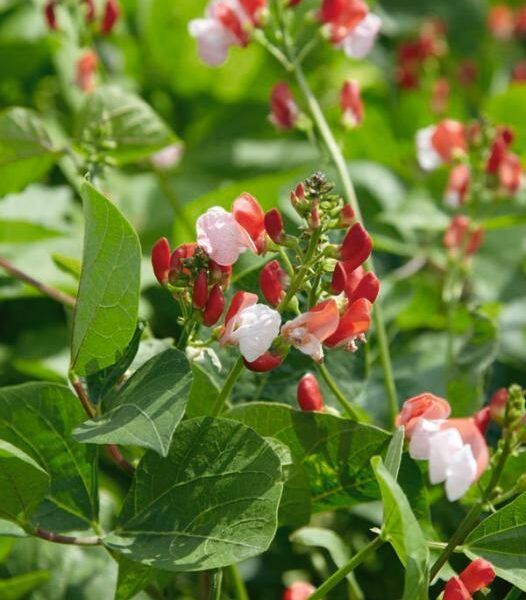 Phaseolus coccineus 'Hestia'Pralbønne som får vakre røde og hvite blomster.