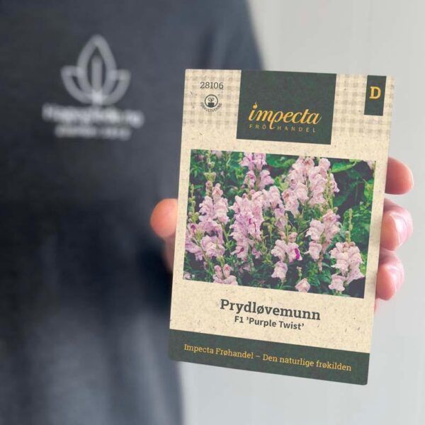 Antirrhinum majus F1 'Purple Twist'Elegant løvemunn med høye blomsterspirer. Fine tegninger i hvitt med bringebærrøde striper som kommer best frem under kjøligere forhold. Høye, solide stilker, perfekt for store buketter og oppsatser. Slående i blomsterbed og store potter.