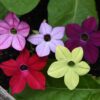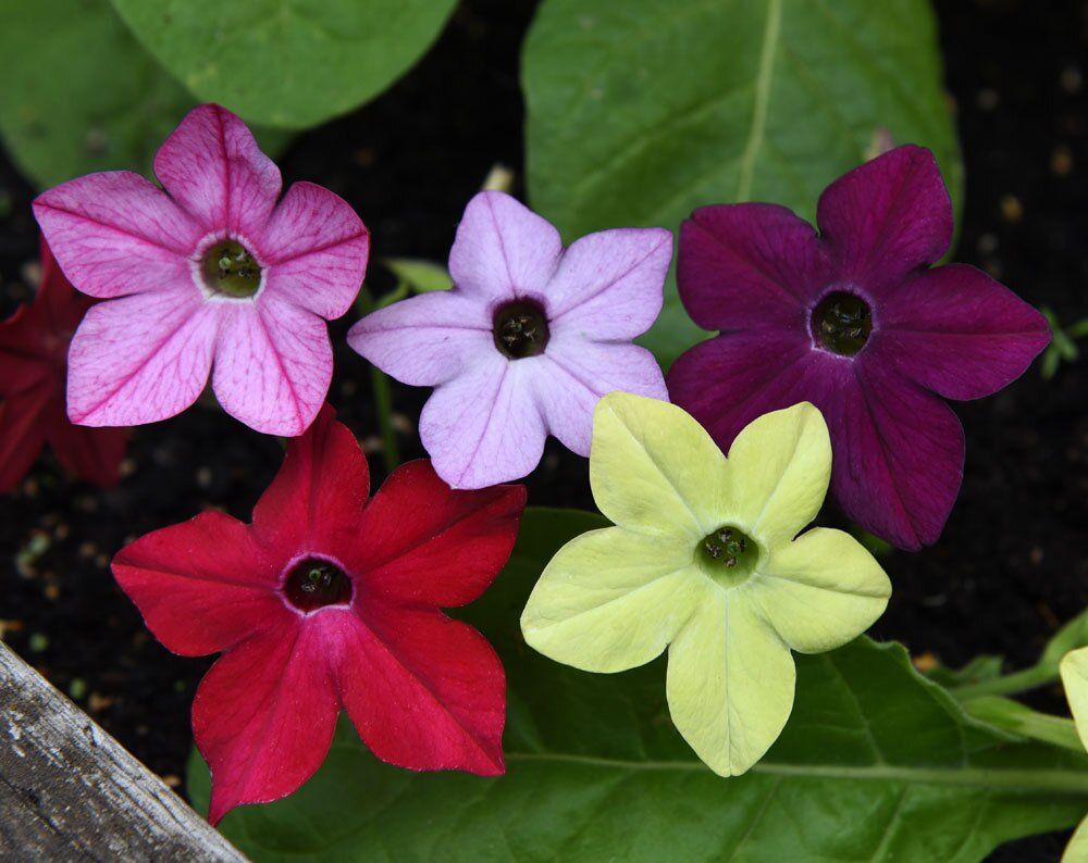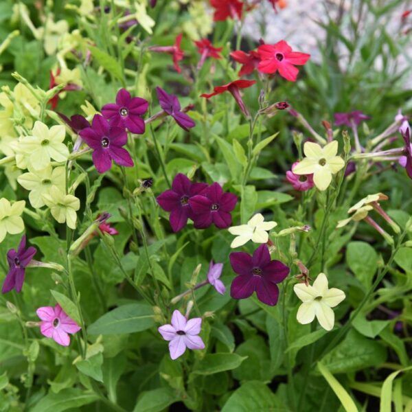 Blomstertobakk Lekker fargekombinasjon i purpurblått, ceriserosa og lime. Busket, forgrenet vekst. Velduftende sommerblomst med rik blomstring i potte og blomsterbed.