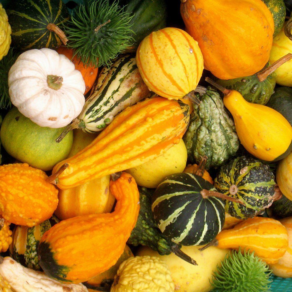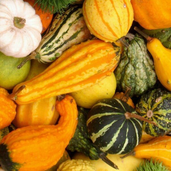 Blanding av pyntegresskar med små frukter i ulike farger og former. Fin til blant annet høstdekorasjoner.