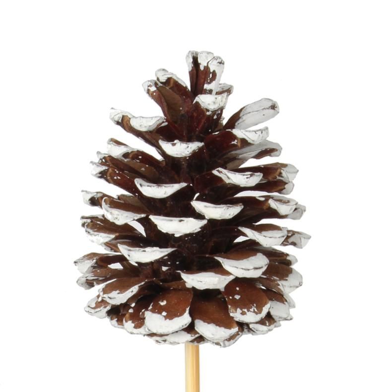 Flott og dekorativ pyntekongle med hvitt i tuppene.