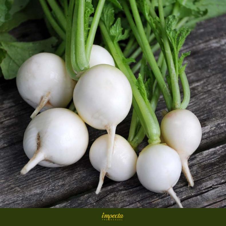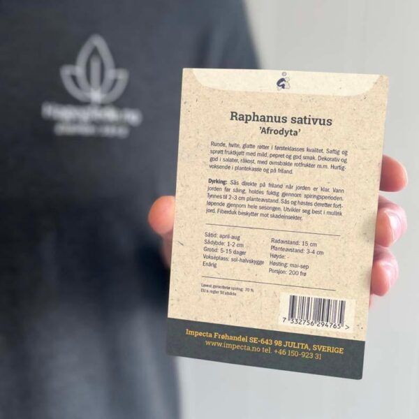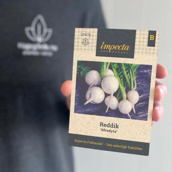 Raphanus sativus 'Afrodyta'Runde, hvite, glatte røtter i førsteklasses kvalitet. Saftig og sprøtt fruktkjøtt med mild, pepret og god smak. Dekorativ og god i salater, råkost, med ovnsbakte rotfrukter m.m. Hurtigvoksende i plantekasse og på friland.