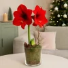 Rød Amaryllis | 1 blomsterløk i glasspotte med pynt.